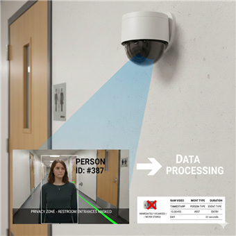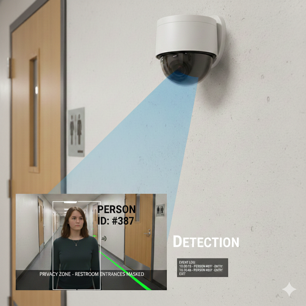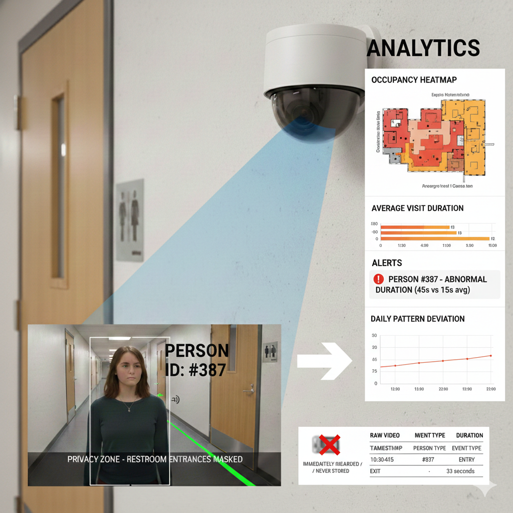 Step 1 Cameras – Positioned to capture the corridor, not the toilet doors themselves. The field of view is deliberately cropped or masked to exclude any view inside the restroom. Step 2 Detection – AGEN edge AI‑based people counting or person‑re‑identification (ReID) models. These models can track a person as they move through the corridor, assign a ID, and log entry/exit events. Step 3 Data processing – AGen Edge AI devices or cloud servers process video in real time. Raw video is often immediately discarded or never stored; only metadata (timestamps, employee IDs, duration) is retained. Step 4 Analytics – AGen Dashboards show occupancy heatmaps, average visit durations, and alerts when an individual’s pattern deviates significantly from their own baseline or from team averages.