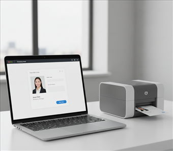 As shown in the image, your team can now create secure, high-quality staff ID cards directly from any laptop or workstation. Simply input employee details, upload a professional photo, and hit "Start Issue" — your personalized ID card prints instantly via a compact, high-speed printer right at your desk.