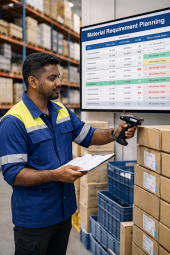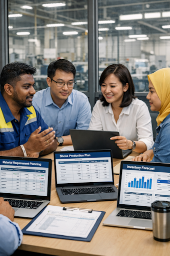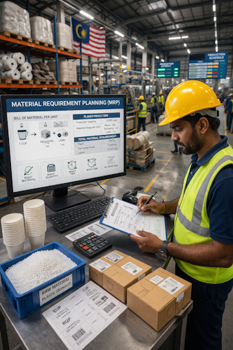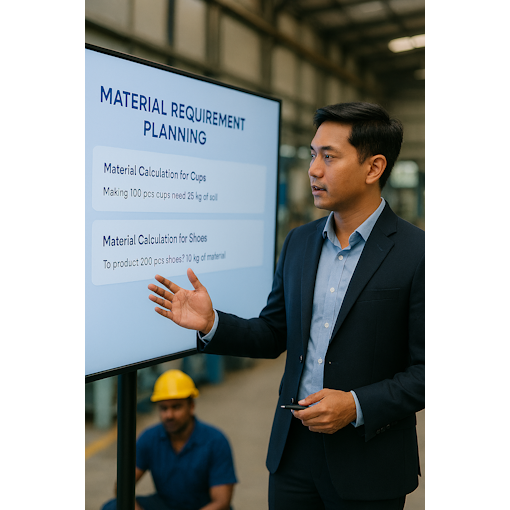 Making 100 cups – how many kg of soil?First, you need to know how much soil is used for 1 cup.Formula: Total material = Material per unit × Number of unitsCalculation: 0.25 kg × 100 = 25 kg of soilSo, 100 cups need 25 kg of soil.Producing 200 pairs of shoesRubber per shoe = 0.5 kgNumber of shoes = 200 pcsFormula: Total material = Material per unit × Number of units0.5 kg × 200 = 100 kg of rubberThe same method applies to all other materials. AGen Material Requirement Planning (AMRP) is a systematic approach used by factories to determine the quantity and timing of raw materials needed for production. It ensures that materials are available when required while avoiding excess inventory. By calculating material usage per unit and multiplying it by planned production quantity, manufacturers can estimate total material requirements accurately. For example, producing cups or shoes requires knowing how much material is needed for one unit before planning bulk purchases. AMRP helps reduce waste, control costs, prevent production delays, and improve overall operational efficiency. It is an essential planning tool for manufacturing industries to support smooth and reliable production processes.