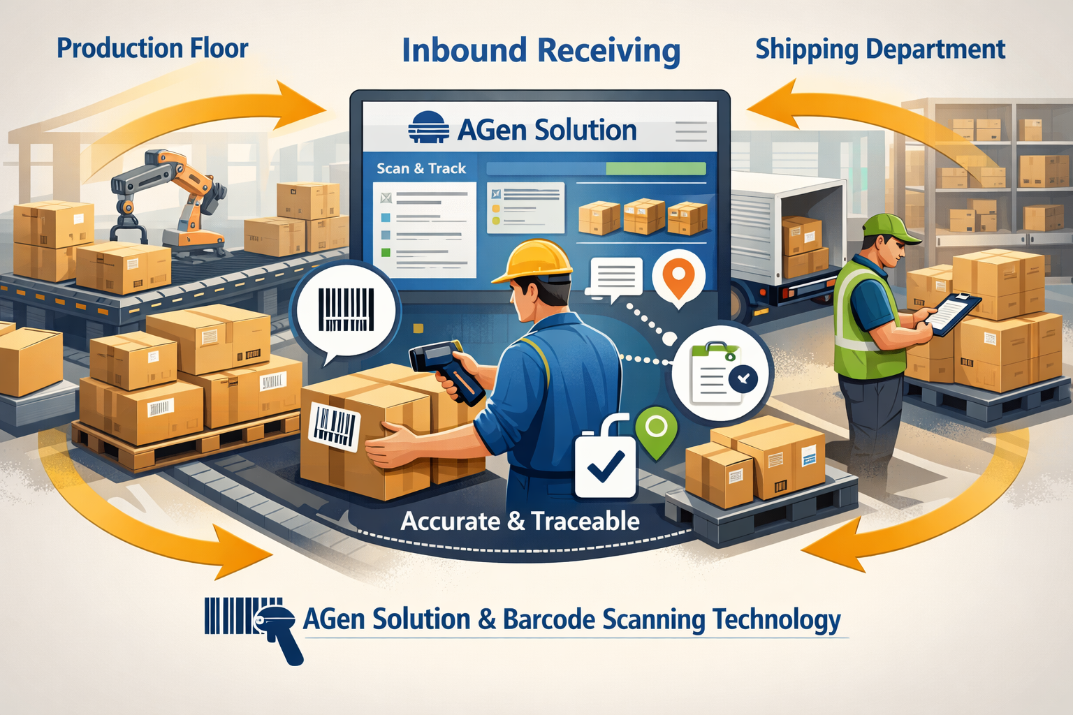 Inbound receiving is the process of transferring finished goods from the production floor to the shipping department in a controlled, accurate, and traceable manner using AGen Solution and barcode scanning technology.