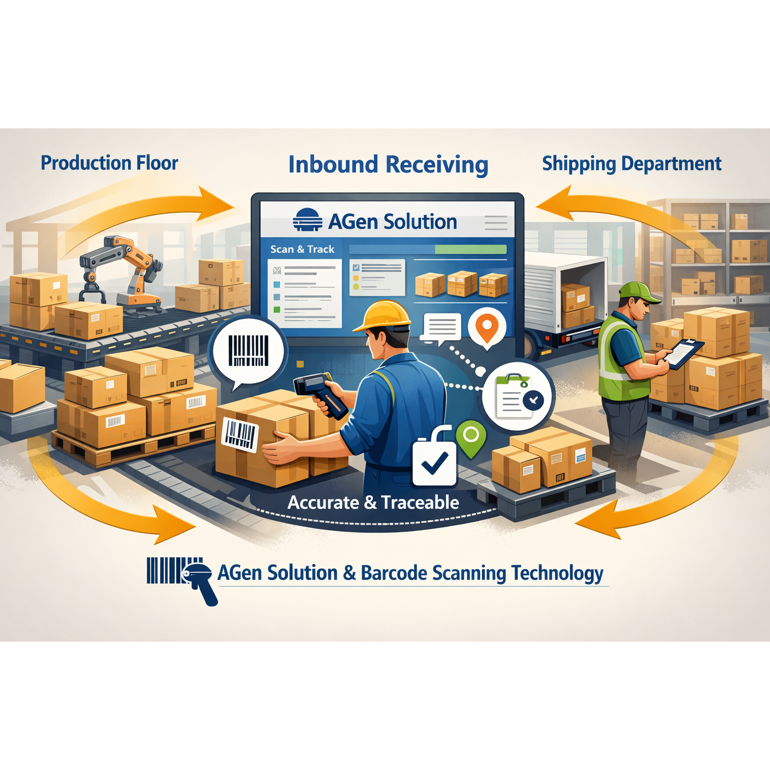 Inbound receiving is the process of transferring finished goods from the production floor to the shipping department in a controlled, accurate, and traceable manner using AGen Solution and barcode scanning technology.